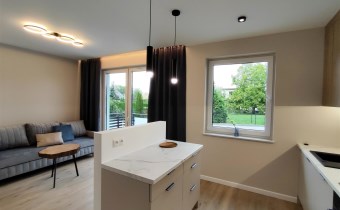 Składa się z pokoju dziennego wyposażonego w kanapę, połączonego z całkowicie umeblowanym aneksem kuchennym, wyposażonym w sprzęty AGD (płyta grzewcza, piekarnik, zmywarka, lodówka).