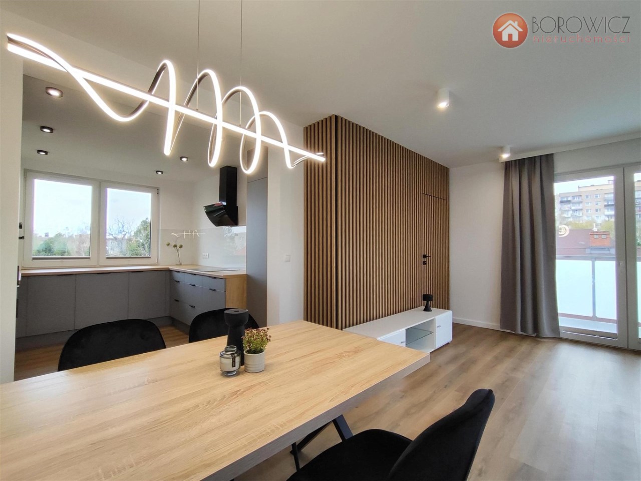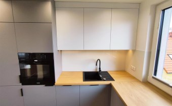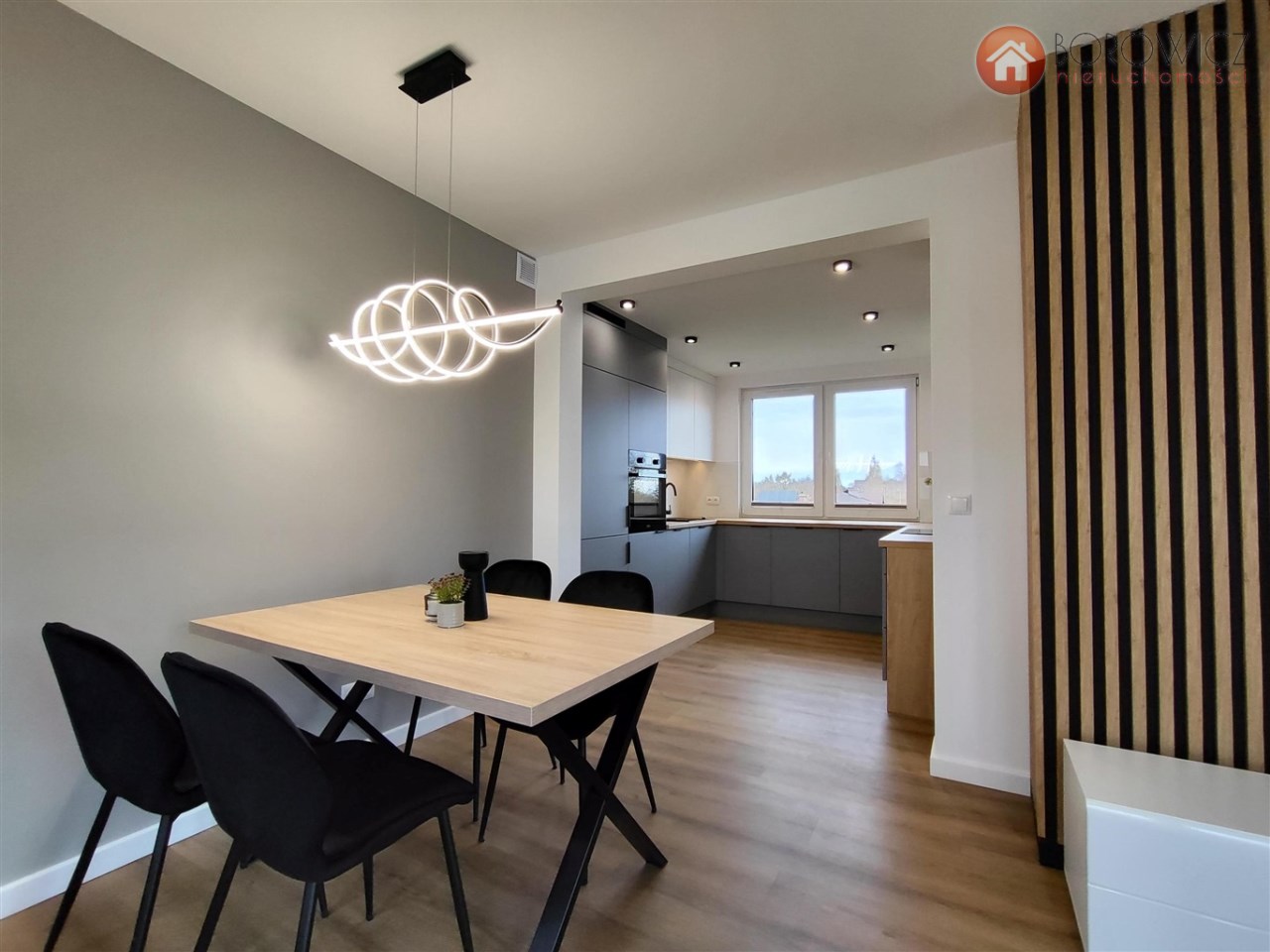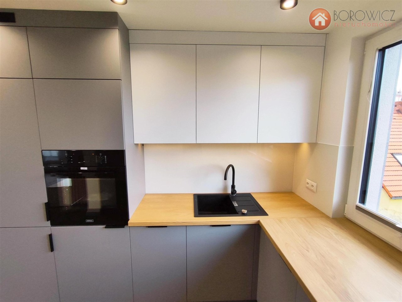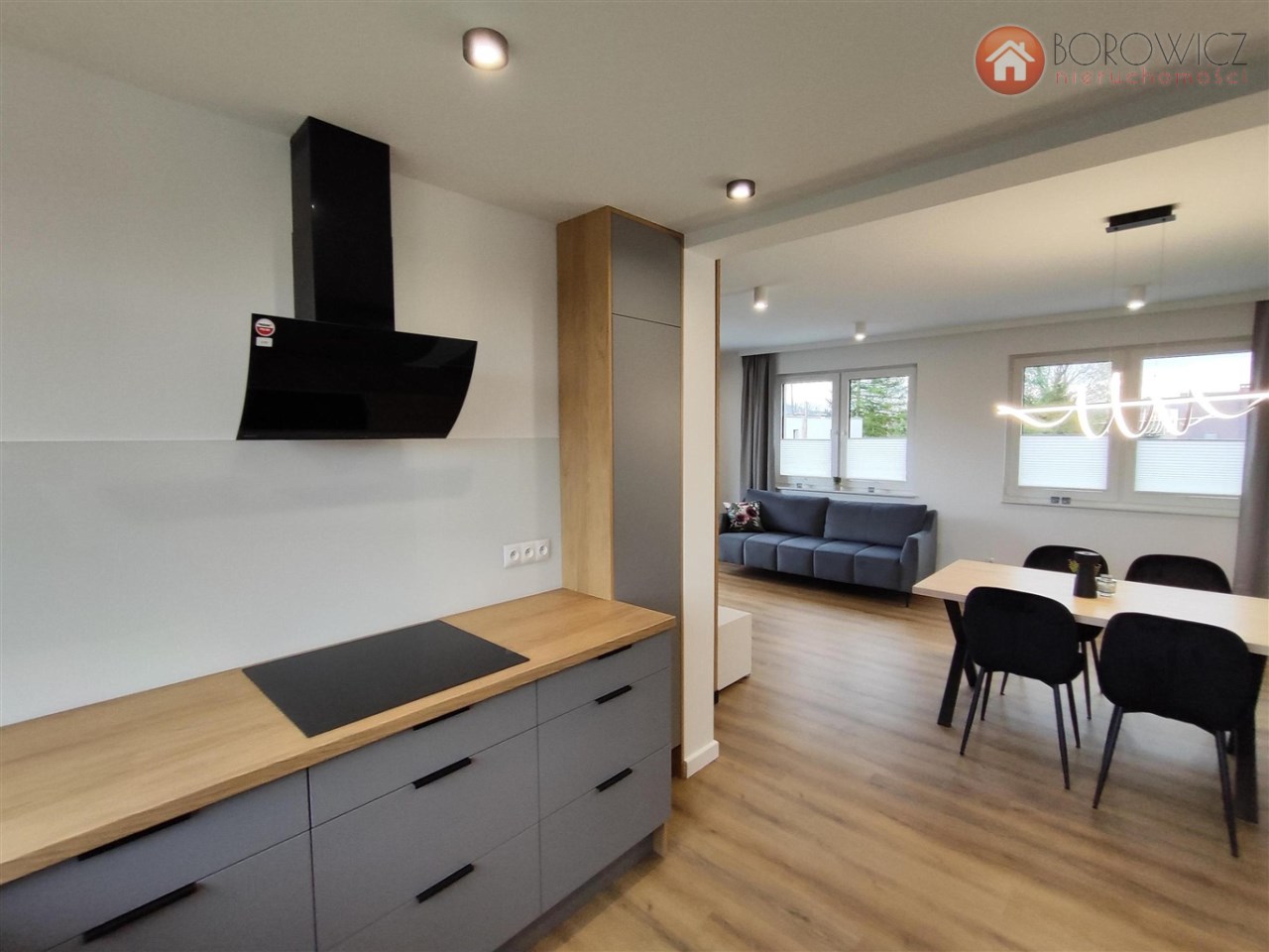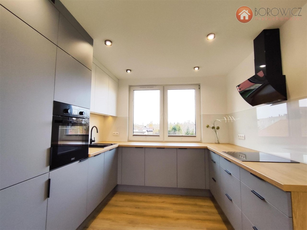 zabudowa meblowa oraz sprzęty AGD: płyta indukcyjna, zmywarka, piekarnik, lodówka, pralka