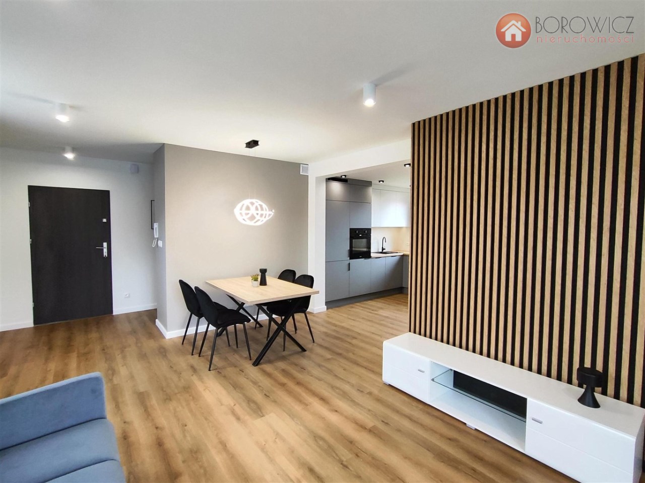 Pokój dzienny wyposażony w kanapę, stół jadalniany z krzesłami, przy wejściu do mieszkania zabudowana szafa.