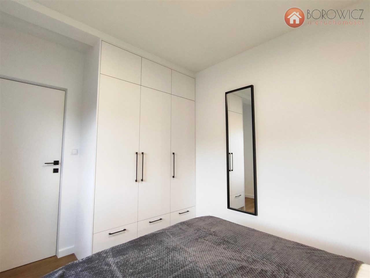 W sypialni łóżko oraz szafa w zabudowie.
